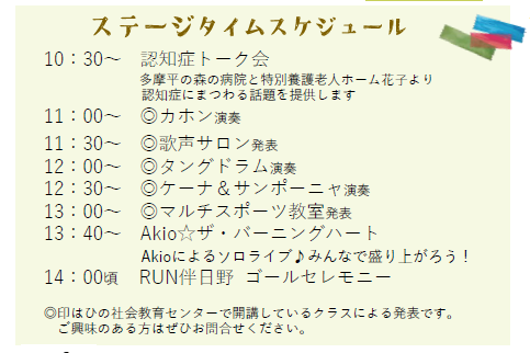 ステージエリアでは歌や楽器、ダンスや認知症トークイベントなどの発表・ショーが行われます。近くに休憩コーナーもありますので、ゆっくりご覧になってください。