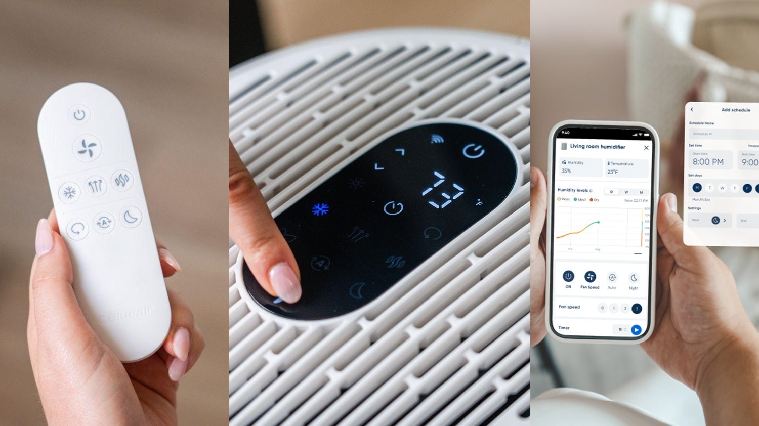 使用シーンやライフスタイルに合わせて、操作方法を選べる柔軟性も魅力です。本体には直感的に操作できるシンプルな操作パネルを搭載しており、リモコンを使用すれば手元で簡単に設定変更が可能です。さらに、Blueairアプリ*12を使うことで、室内外の空気質のモニタリングや首振り角度・速度の設定、フィルター寿命の確認といった多彩な操作も可能です。