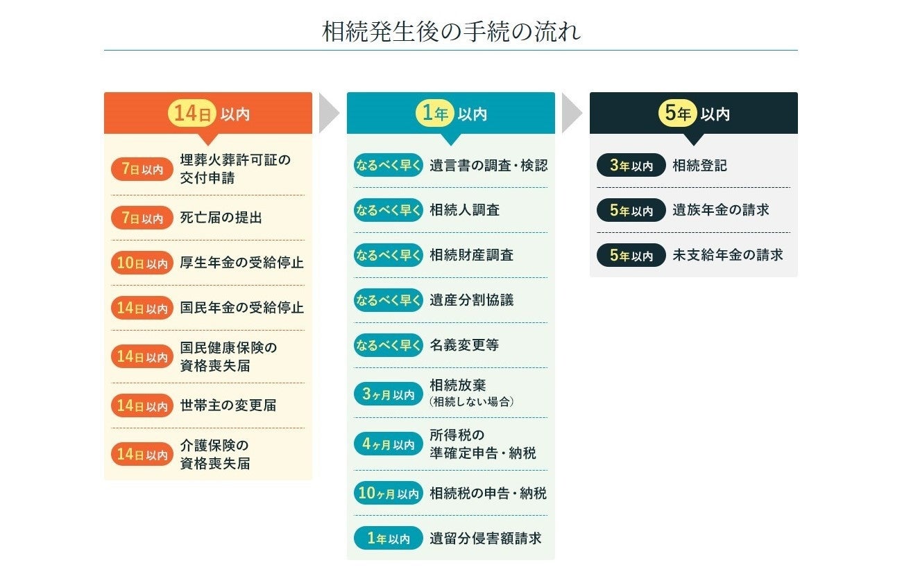 また、相続のお手続は複数のことを並行して進めていかなければならないケースもあるため、それらの手続を時系列でわかりやすく掲載しています。