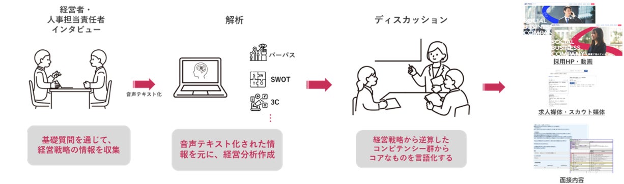 本サービスは、経営層や部門責任者へのインタビューから得た情報をAIが客観的に分析し、企業文化や活躍している社員の共通点を可視化します。これにより、求める人物像の明確化が可能となり、採用媒体の選定や面接設計の最適化を図ることで、採用活動の全般にわたってより戦略的な意思決定を後押しします。