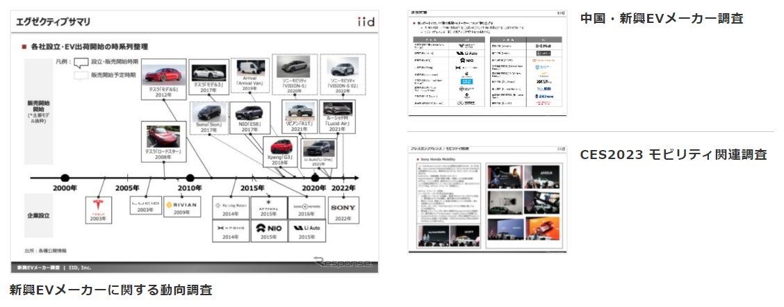 「CES2023 モビリティ関連調査」「BYDのNEV戦略~中国が創出した世界一のEVメーカー~」「中国・新興EVメーカー調査」「コネクテッド領域におけるサプライヤー動向調査」など自動車産業の各分野を整理・分析した調査レポートを提供。