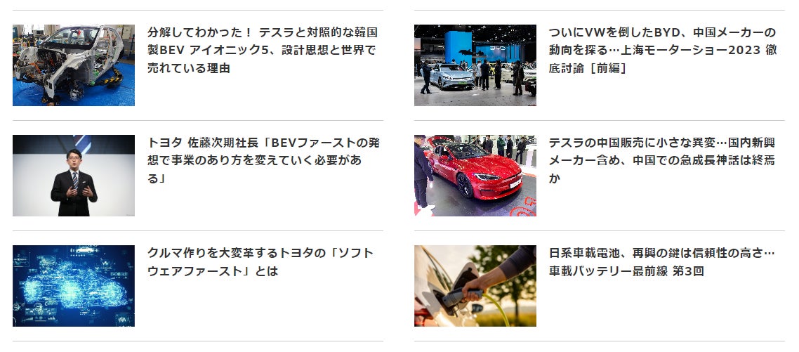 CASE、MaaSの最新情報や「自動車業界株価ウォッチ」「人事情報」なども。自動車業界の最新報道に加え、展示会レポート、開発者インタビュー、業界を深掘りする独自視点の連載や解説記事も配信。