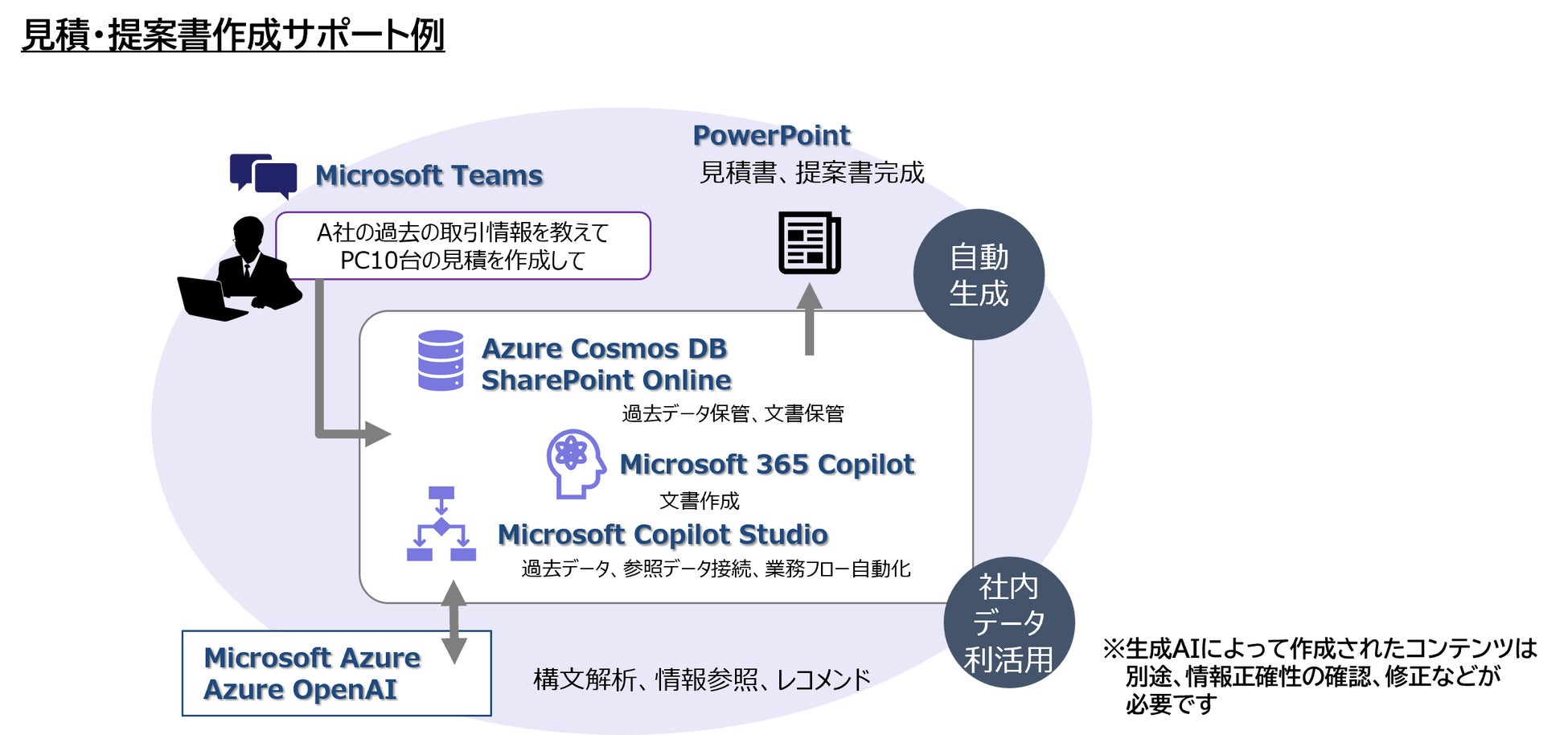 営業業務向けのAI活用サービスは、生成AIが顧客に関する情報の収集から、見積書、提案書の作成を効率化するものです。お客様が使用しているSFA(営業支援)/CRM(顧客管理)システム、Microsoft アプリケーションとMicrosoft 365 Copilotを連携させることが可能です。Microsoft Teamsを介してチャット形式で指示をすると見積の自動作成や、関連提案情報の取得を簡単に行えるほか、提示された情報をCopilot in PowerPointに読み込ませることで、提案先に応じた提案書のドラフトを作成でき、営業業務の負担を軽減します。