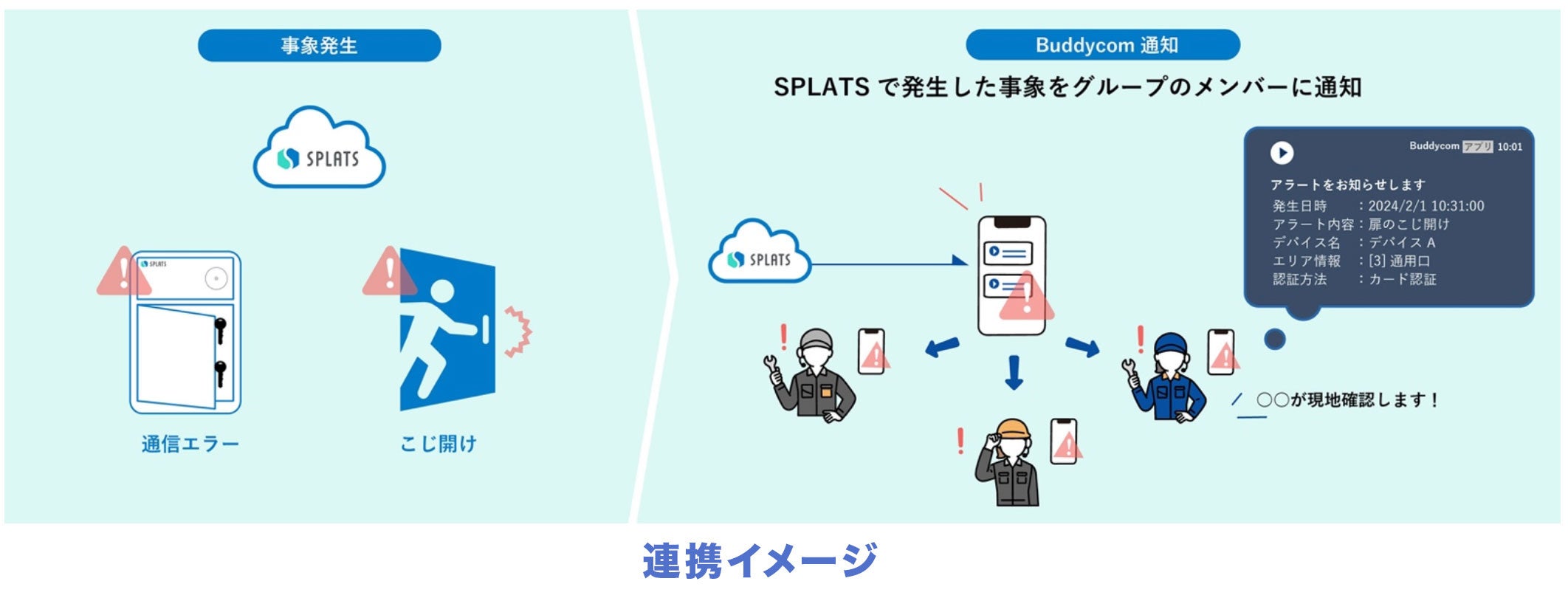 「SPLATS」と「Buddycom」が連携することで、物理セキュリティに関わる重要な情報を迅速かつ確実に共有することが可能となります。文字情報だけでは見逃されがちなアラートを関係者全員に音声で一斉送信することで、緊急時の対応を迅速に行うことを実現します。