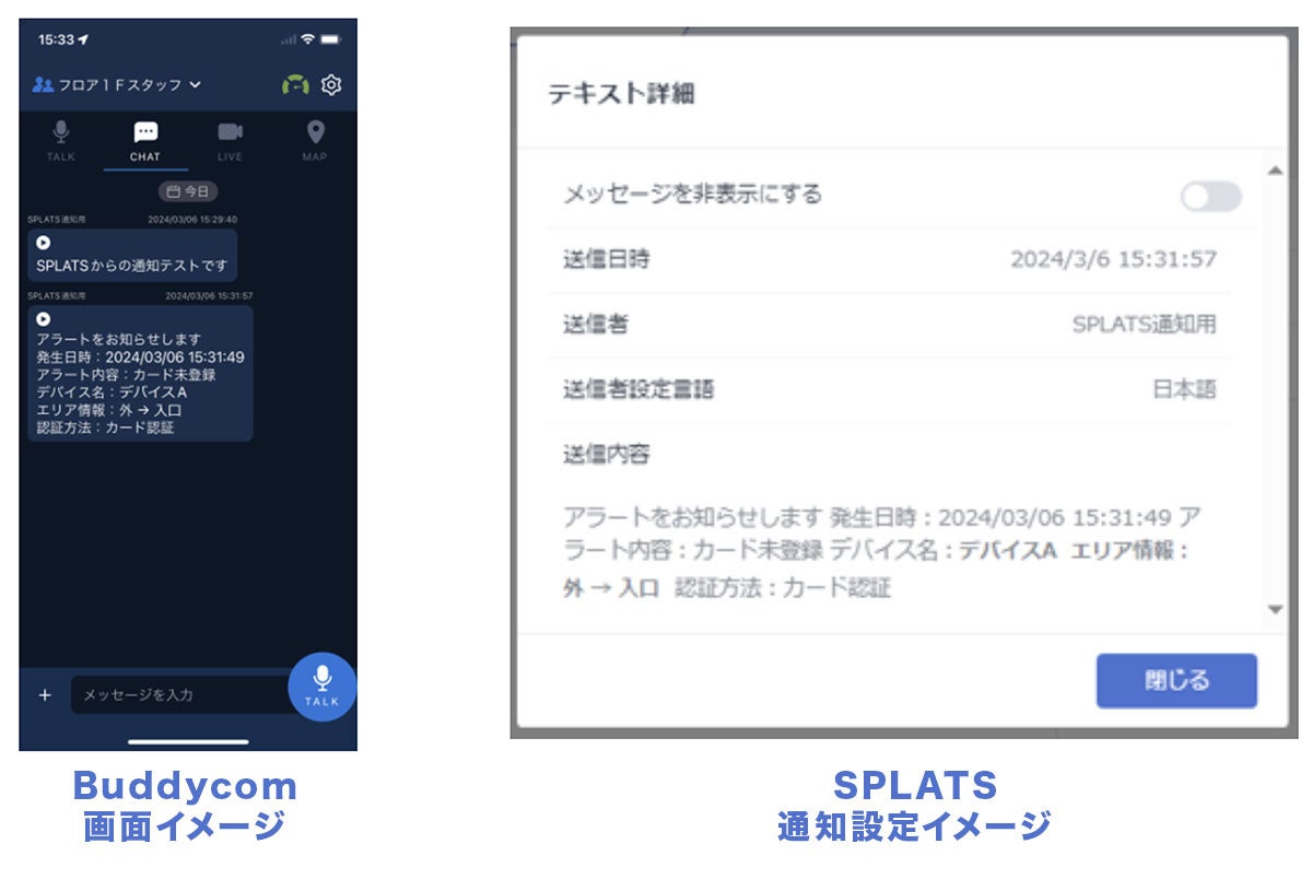 サイエンスアーツが提供する「Buddycom」は、デスクレスワーカー向けのスマートフォンを使用したチームコミュニケーションアプリです。グループ通話、映像・位置情報の共有、会話音声のテキスト化や翻訳なども実現しています。今回の連携開発によって、SPLATSで発生した異常をBuddycomですぐに確認することができ、適切な対処が可能になります。