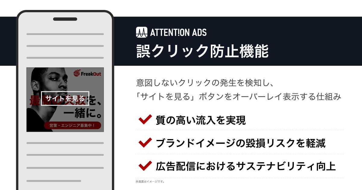 フリークアウトはAttention Adsを通じて、貴重な広告予算を、誤クリックを誘発する、あるいはブランドイメージを毀損するような低品質な配信面に投下するのではなく、ユーザー体験に優れ、ユーザーの注目も集める配信面に投下することで、広告効果の最大化に努めてまいります。
