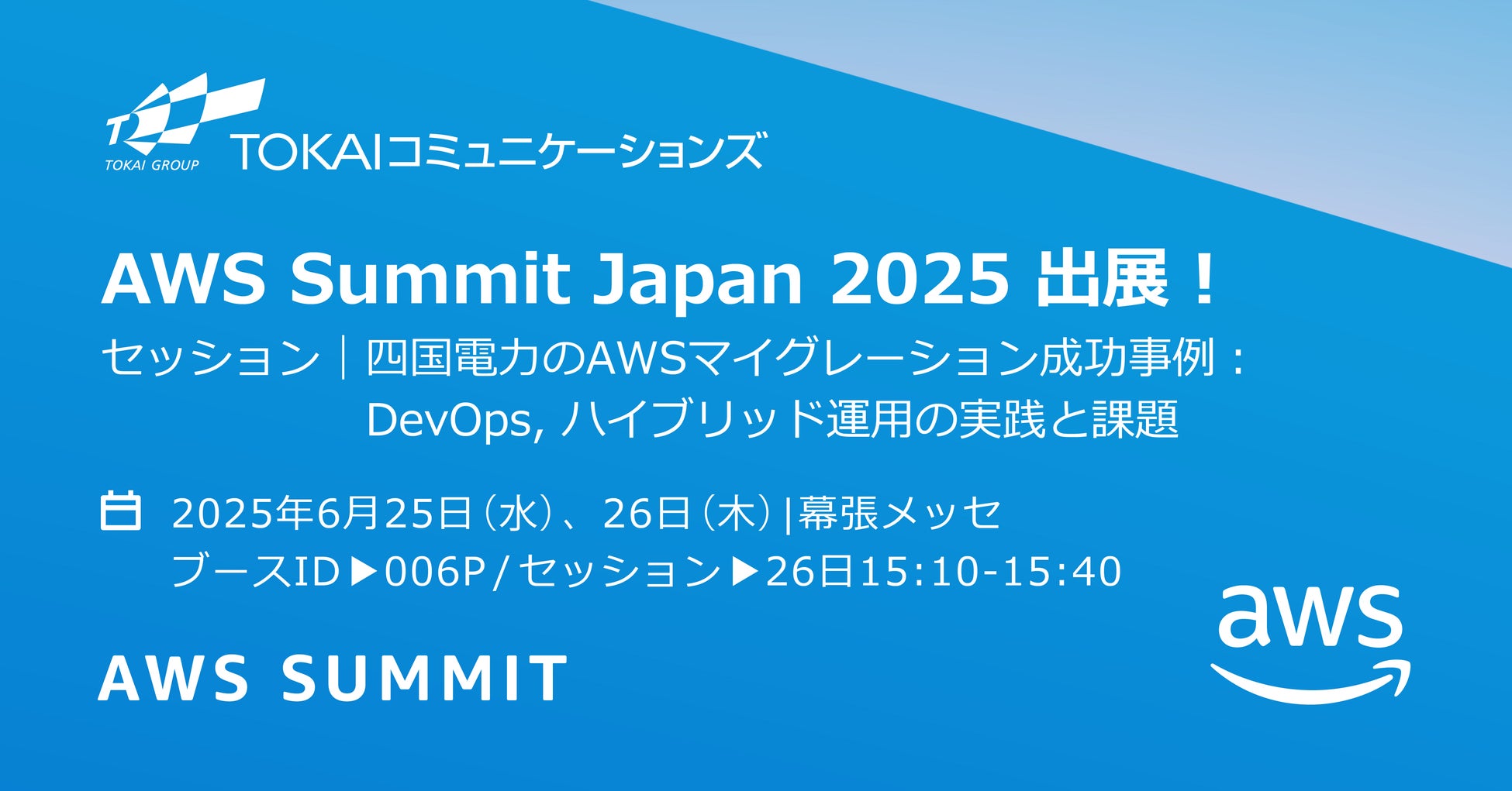 株式会社TOKAIコミュニケーションズ(本社:静岡県静岡市葵区、代表取締役社長:高橋 強、以下 当社)は、2025年6月25日(水)、26日(木)に幕張メッセで開催される日本最大のアマゾン ウェブ サービス(以下 AWS)を学ぶイベント「AWS Summit Japan 2025」にプラチナスポンサーとして出展いたします。