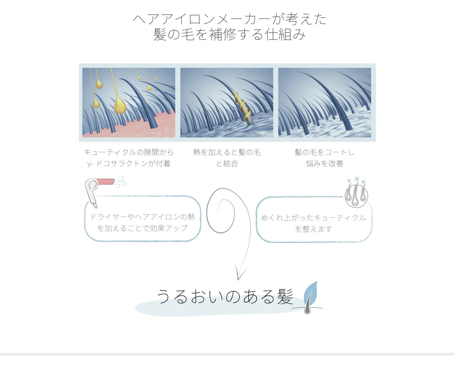 ナタネ由来で安全性が高いγ-ドコサラクトンを配合し、ヘアアイロンの熱によって髪に結合。キューティクルのめくれを整えてダメージを補修するので、うねり、絡まり、まとまらないなどの髪の悩みを改善したい方におすすめです。