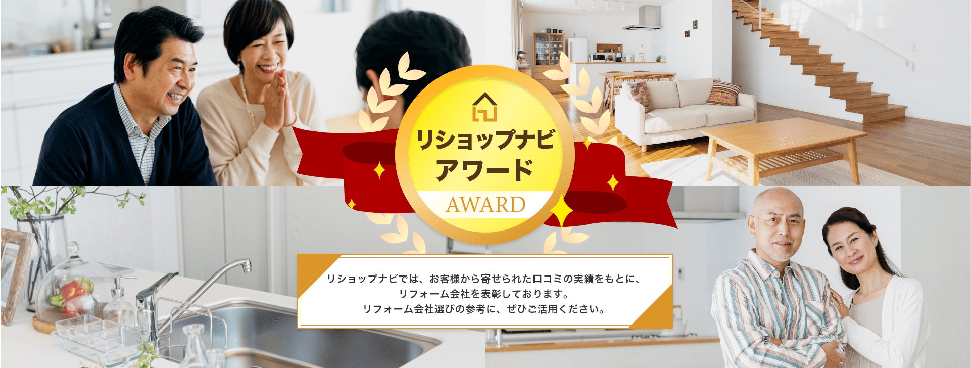 そんな「リショップナビ」が開催する「リショップナビアワード」は、お客様から寄せられた口コミを元にしたデータを統合し、特に優秀な成績を収めたリフォーム会社を「成約件数 東日本/西日本 第1位〜第3位」、「成約金額東日本/西日本 第1位〜第3位」、「ユーザー満足優良会社」の3項目で表彰する加盟店の表彰制度です。2022年度は約4,000社の加盟店から155社が受賞いたしました。