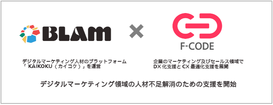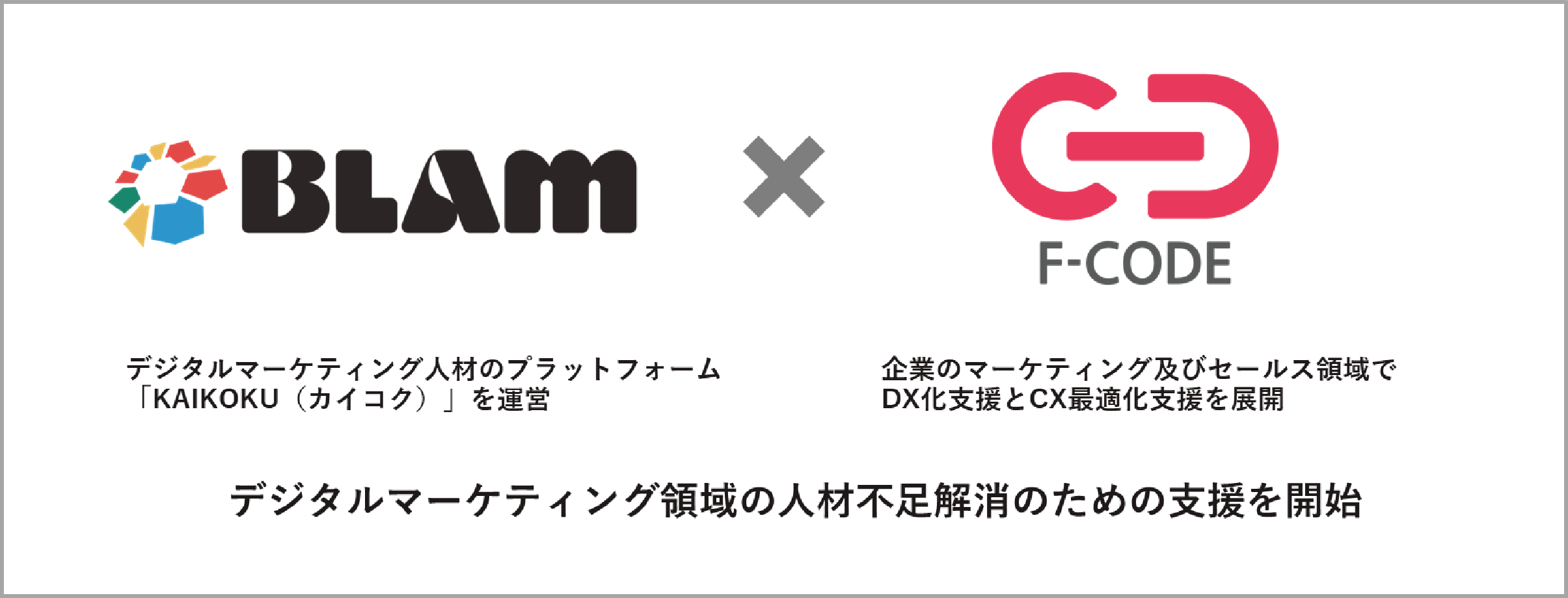 株式会社エフ・コード(本社:東京都新宿区、代表取締役社長:工藤 勉、証券コード:9211、以下「当社」)は、この度デジタルマーケティング人材のプラットフォーム「カイコク」を運営する株式会社BLAM(本社:東京都品川区、代表取締役:杉生 遊、以下「BLAM」)と業務提携いたしました。
