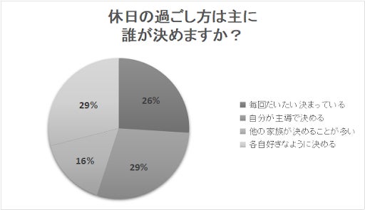 次に「休日の過ごし方は主に誰が決めますか?」というアンケートも行いました。すると一番多い回答は、「自分が主導で決める」で29%でした。