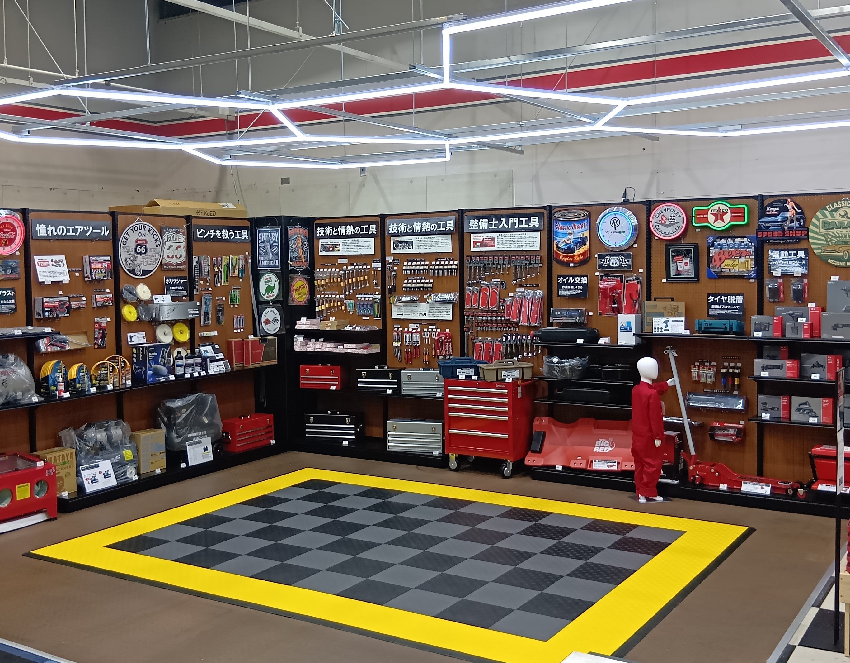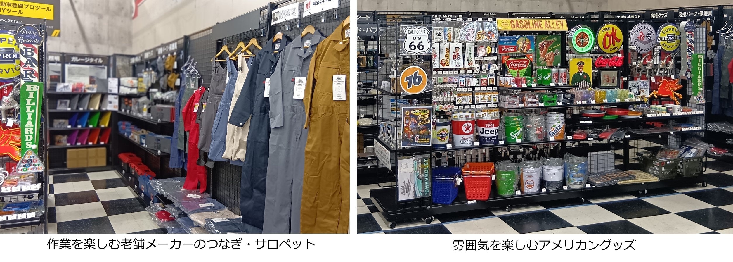店舗コンセプトは「『次は何しよう?』が見つかる工具とDIYのセレクトショップ」。自動車整備士も使用する高品質な工具を中心に、多くのプロショップが使用するラッピングシートや特殊塗料など、愛車を自分らしくカスタマイズできるDIY商品を展開。アメリカン雑貨など、ガレージライフの世界観を感じられるアイテムも豊富にそろえ、工具の専門性とライフスタイルの融合を図ります。