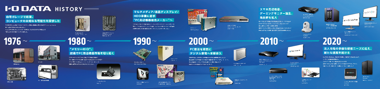 アイ・オー・データは、1976年1月10日、創業者細野の自宅ガレージから始まりました。当初は織物のカラー画像読み取り装置や紋紙加工システムといった独自技術を用いた特注品の開発からはじまり、時代の変化に応じて、メモリ、マルチメディア、HDD、液晶ディスプレイ分野など、総合周辺機器メーカーとして新たな分野に挑戦しながら、歩みを重ねてきました。