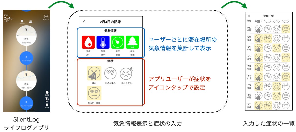 季節性症状を訴える方々のQuality of Life (QOL)を向上するためには、まず、日々の生活(行動)・体調・気象の関係に気づくことが大切です。そのようなニーズに応えるべく、弊社ライフログアプリ「SilentLog」に、症状を入力して一覧表示する機能を追加しました。SilentLogで日々の行動を振り返り、気象情報を確認しながら症状を入力できる機能です。AI分析により、ユーザーが一日に訪れた場所の気象情報を自動集計するため、気象情報入力が不要であり、日々の症状を入力するだけで、行動と気象と症状の関連性を確認できます。結果、重症化する前に薬を飲んだり、医療機関を受診したりして、迅速な症状への対処が期待されます。また、あらかじめ気象と体調の関係が分かるような日記をつけておくと、医療機関受診時に伝わりやすくなるメリットもあります。
