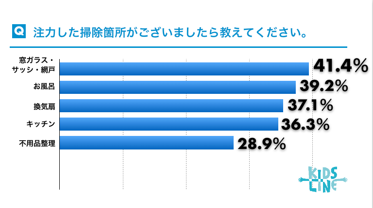 アンケートでは、大掃除をすると回答した人に「大掃除で注力したい掃除箇所」についても聞きました。上位5つに入ったのは、以下の箇所です。