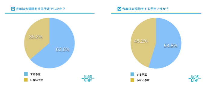 全国で24時間スマホで呼べるベビーシッター・家事代行サービス「キッズライン」を運営する株式会社キッズライン(本社:港区六本木/代表取締役社長:経沢香保子)は、キッズラインの利用者に「2022年 大掃除の実態」に関するアンケート調査を実施。大掃除を54.8%の人が「する」予定と回答し、昨年実施した調査結果と比較すると、大掃除をする予定の人の割合が1割近く減少していることがわかりました。