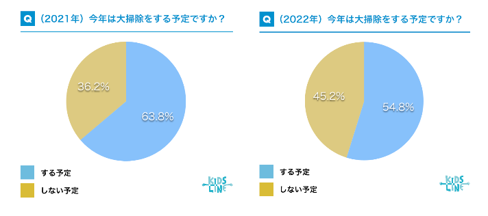 「今年大掃除をする予定ですか」という質問の回答を昨年(2021年)と今年(2022年)で比較したところ、「大掃除をする予定」と答えたのは、2021年が63.8%、2022年は、昨年よりも約9ポイント少ない、54.8%という結果となりました。