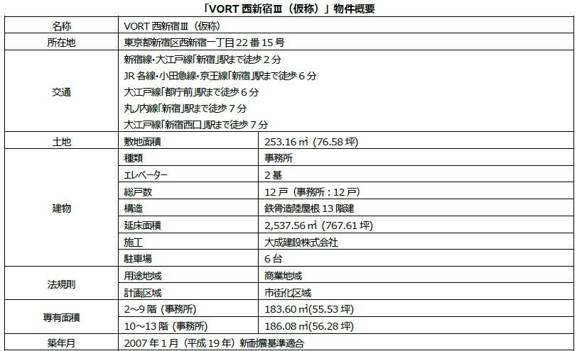 「区分所有オフィス®」を主軸に資産形成コンサルティングを行う株式会社ボルテックス(東京都千代田区 代表取締役社長 兼 CEO 宮沢 文彦、以下当社)は、「VORT西新宿Ⅲ(仮称)」を取得しました。