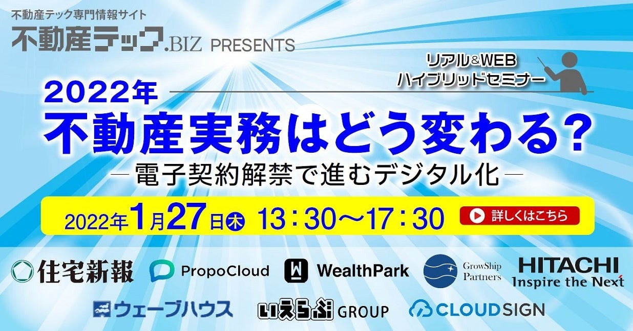 不動産営業支援SaaS「プロポクラウド」を提供する株式会社Housmart(本社:東京都中央区、以下:ハウスマート)の代表取締役・針山昌幸が、住宅新報が主催するオンラインセミナー「2022年 不動産実務はどう変わる?〜電子契約解禁で進む〜」に登壇します。基調講演には国土交通省 不動産産業課 課長・井﨑 信也 氏も登壇する業界注目のセミナーで、2022年1月27(木)13:30~17:30に開催されます。