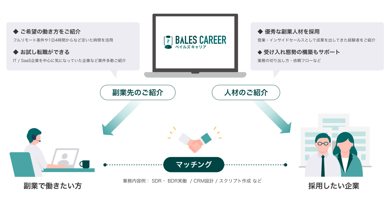 スマートキャンプ株式会社(本社:東京都港区、 代表:古橋智史、林詩音、以下「スマートキャンプ」)は、転職エージェントサービス「BALES CAREER(ベイルズ キャリア)」において、インサイドセールス(※1)人材に特化した副業マッチングサービスの提供を開始しました。