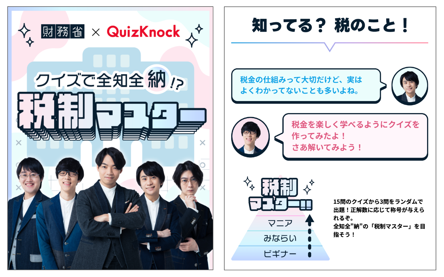 また、同日11月9日(木)には、特設ページ「クイズで全知全納!?税制マスター(https://zaimusho.quizknock.com/)」が公開されました。全15種類の税にまつわるクイズからランダムで3問が出題され、その正解数に応じて称号が与えられます。全知全”納”の「税制マスター」を目指しながら、分かりやすい解説で税について学ぶことができる内容となっています。ぜひコラボ動画とあわせてお楽しみください。
