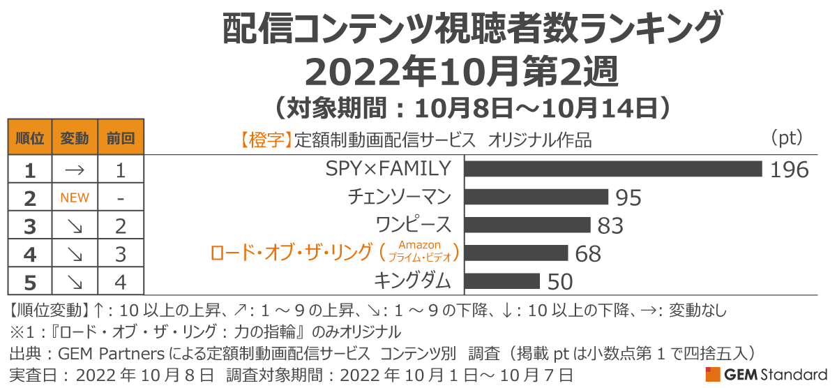 エンタテイメント業界に向けたデータ×デジタルマーケティングサービスを提供するGEM Partners株式会社(ジェムパートナーズ、所在地:東京都港区、代表取締役:梅津文)は10月21日(金)、複数の定額制動画配信サービスを横断して集計した2022年10月第2週の「配信サービス視聴者数ランキング(調査対象期間:10月8日~10月14日、調査対象:日本在住15~69歳男女)」を発表します。