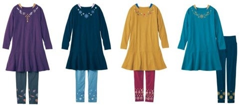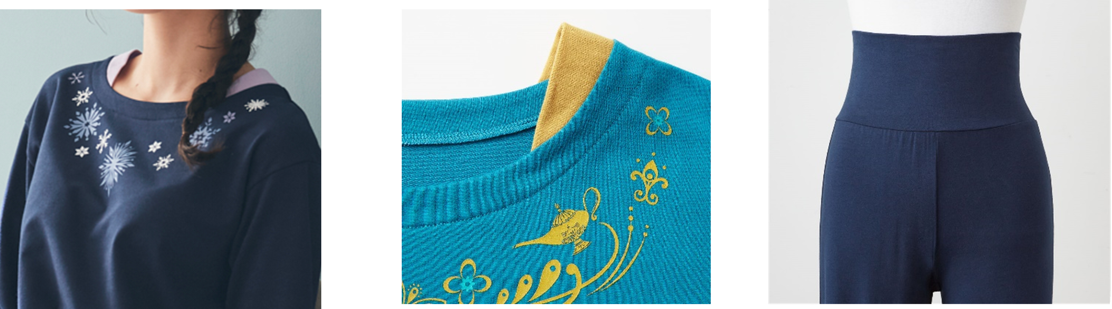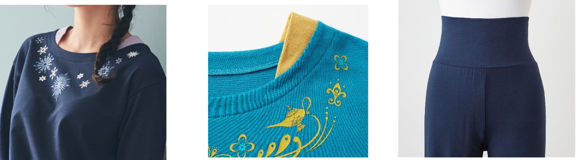 デザイン面ではバラや氷の結晶など、キャラクターそのものではなくディズニープリンセス・ヒロインをイメージしたモチーフをちりばめてプリントすることで洗練された雰囲気に仕上げました。また、トップスは首回りを人気の重ね着風のデザインで、裾はフレアです。各色ともディズニープリンセス・ヒロインをイメージしたカラーで展開し、急な来客にもそのまま対応できるアウターライクなデザインにしています。