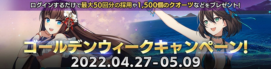 また本日からは、ログインするだけで最大で60回分の採用(ガチャ)をプレイできるアイテムが入手できたり、コンソーシアム(ギルド)に加入/出勤チェックをするとゲーム内アイテムを獲得することができるゴールデンウィークキャンペーンを開始いたしました。