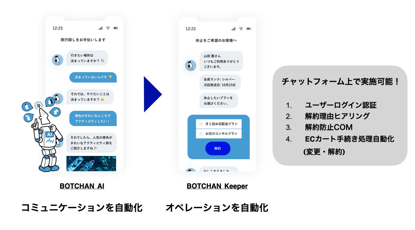 「BOTCHAN AI」に集約させたお問い合わせは、「BOTCHAN Keeper」と連携することで、チャット内で手続きを完結させることが可能です。ECシステム側の自動処理との連携を行うことで、効果改善と対応の自動化を実現します。