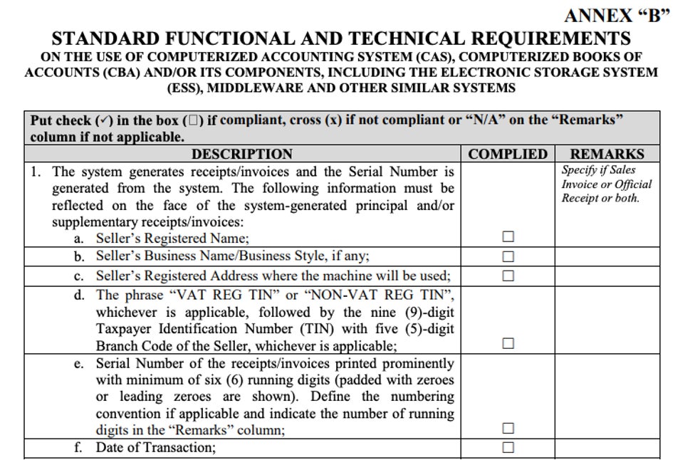 CBA(Computerized Books of Accounts)は、財務諸表、仕訳帳、総勘定元帳といった会計帳簿がターゲットですが、CAS(Computerized Accounting System)は、会計帳簿だけではなく、請求書、領収書や、源泉徴収税フォームなど、会計周辺の帳票も会計システムの利用、承認(評価)のターゲットになります。