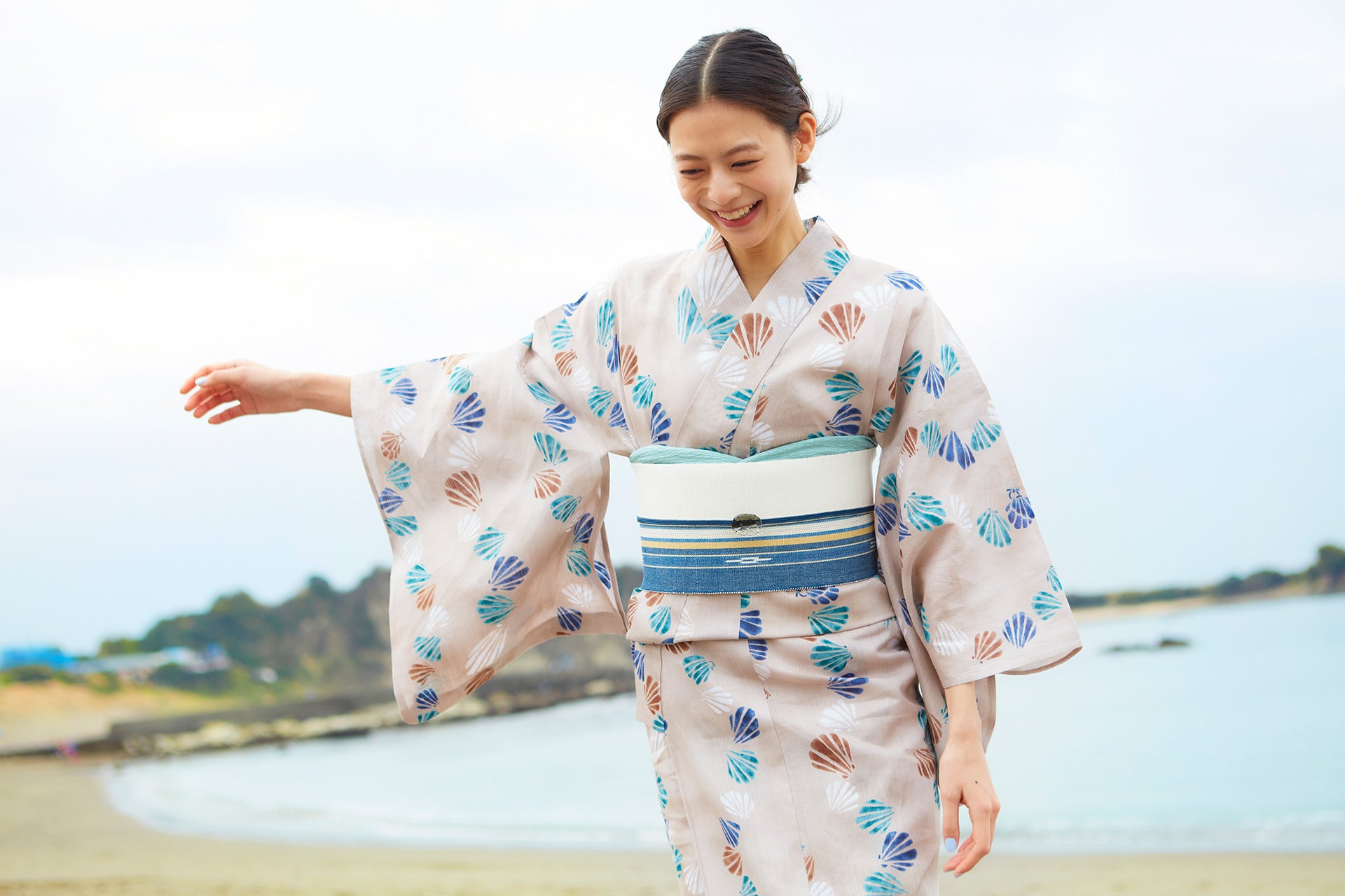 海辺の楽しい空気感を表現したデザイン。カラフルな貝殻と楽器のカスタネットをモチーフにしています。遊び心満載のゆかたです。