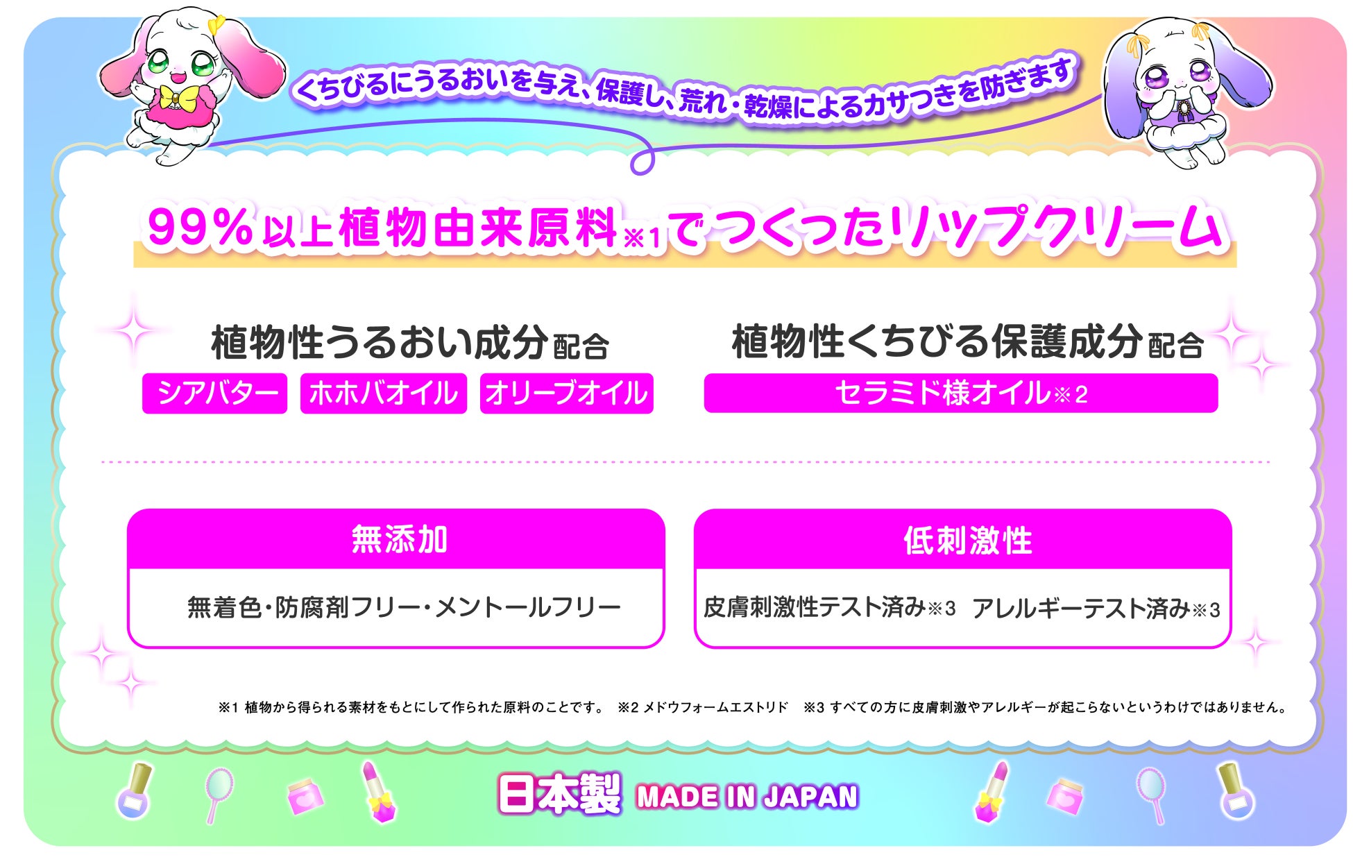 99%以上植物由来原料(※1)で作られていて、お子さまのくちびるにうるおいを与え、保護し、荒れ・乾燥によるカサつきを防ぎます。