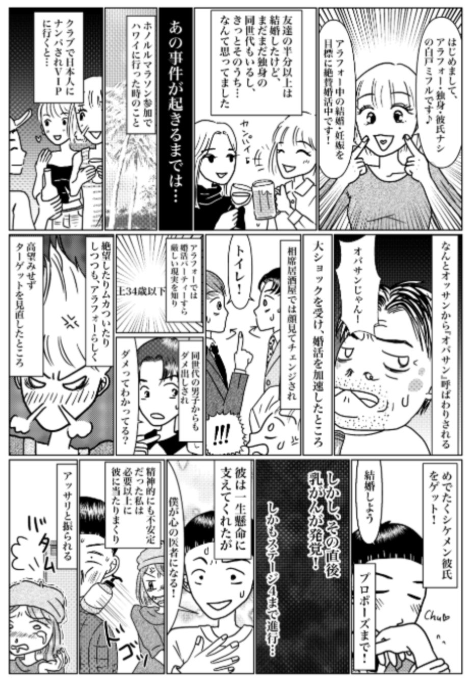まさかの、35歳の時にステージ4乳がんに罹患し、精神状態が不安定になり、結婚も考えてくれていた当時の彼氏に振られてしまいました。しかし、持ち前のポジティブパワーでがんを乗り越え、闘病中に夢であった漫画家(とライター)デビューも果たしました。