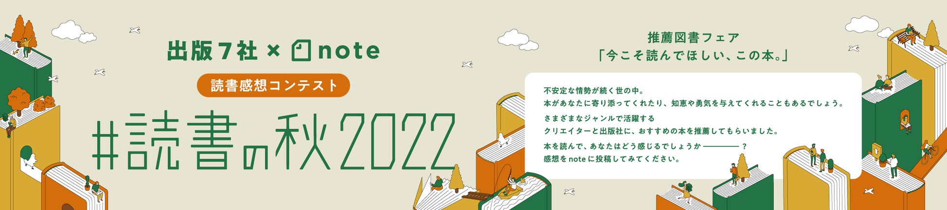 「#読書の秋2022」は、読書感想作品を、文章、イラスト、マンガ、動画、写真など表現の形式を問わずに募集するコンテストです。noteと出版社の合同で2020年から実施しており、今年は、全国の書店(約140店舗)と連動して大々的に読書の秋を盛り上げます。また、参加出版社だけでなく、各ジャンルで活躍しているクリエイターからも推薦図書を選出してもらいます。選書のテーマは「今こそ読んでほしい、この本。」です。