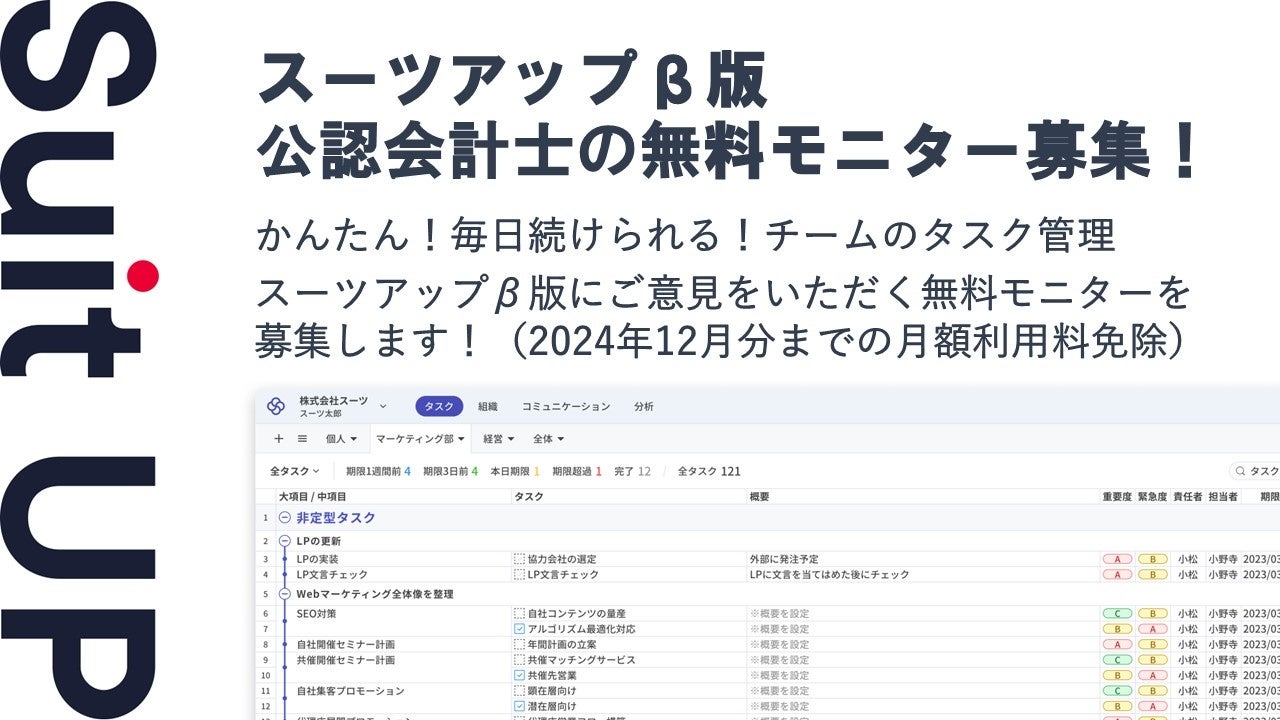 株式会社スーツ(所在地:東京都千代田区、代表取締役社長CEO:小松 裕介)は、チームでかんたん、毎日続けられるプロジェクト・タスク管理ツールの経営支援クラウド「Suit UP」(スーツアップ)の公認会計士の無料モニターを募集いたします。