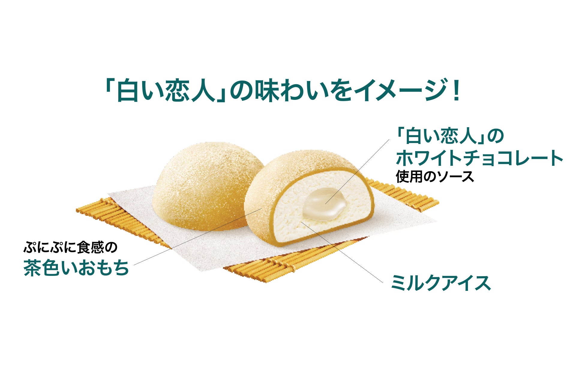 3.「白い恋人」の味わいをイメージし、「白い恋人」のホワイトチョコレートを使用したソースを、ラング・ド・シャの風味香るミルクアイスと冷凍下でもやわらかいおもちで包んだこだわりの雪見だいふくとなっています。