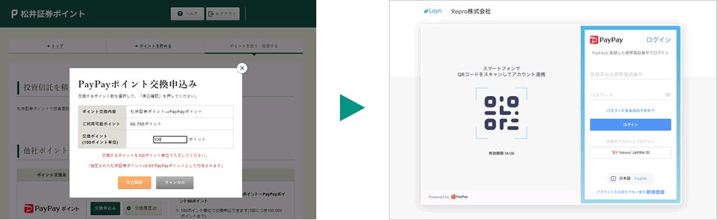 PayPayポイントが自社ポイントの交換対象となるのは、主要ネット証券において初*1の取り組みです。なお、本サービスの提供にあたっては、Repro株式会社のデジタルポイント発行サービス「Loyn」を導入いたします。「Loyn」を活用することで「松井証券ポイント」から「PayPayポイント」への即時交換を可能とし、日常生活の幅広い場面でご活用いただけるようにいたします。