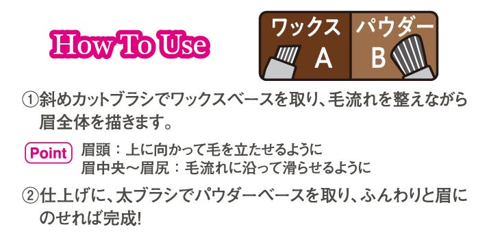 ・ワックスベース:しっかりと発色する濃い目のカラーは、眉毛のすき間を埋めつつ、眉の形を整えます