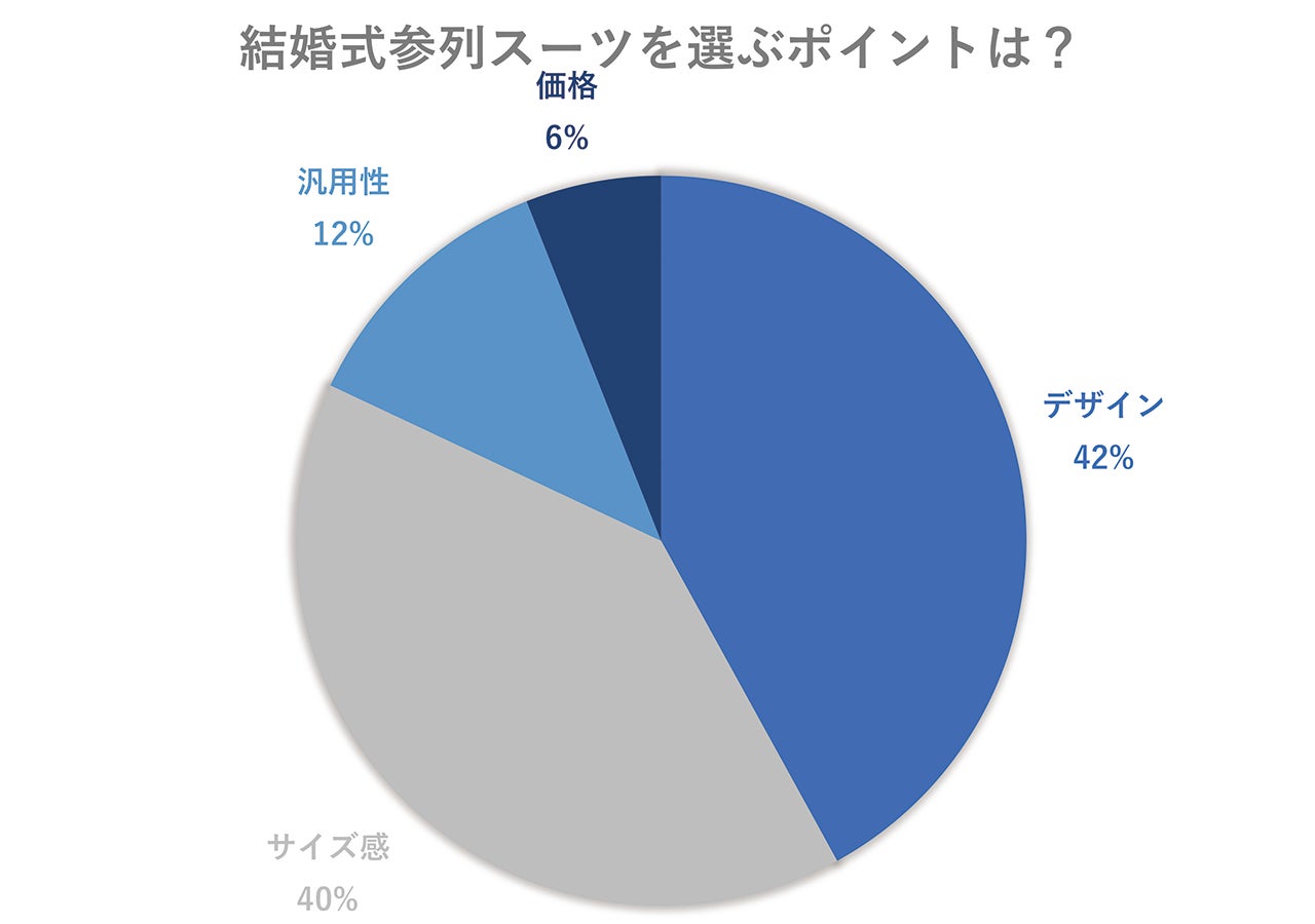 42%が「デザイン」と回答。次いで、「サイズ感」が40%、「汎用性」が12%、「価格」が8%と結婚式参列スーツを選ぶなら「デザインとサイズ感」がほぼ同票で選ぶポイントにするという結果になりました。