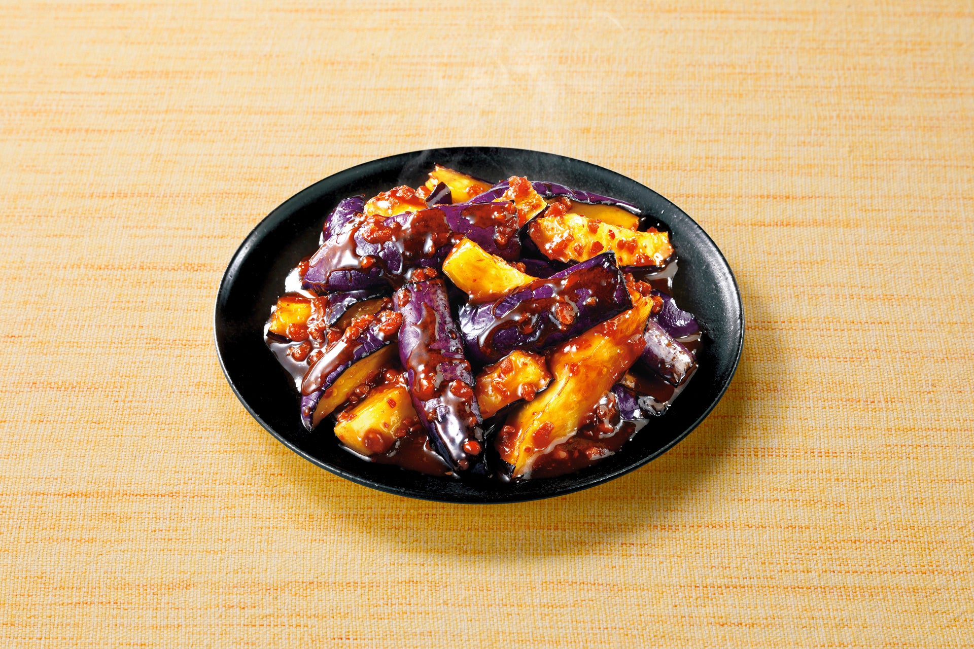 「麻婆茄子」は、なすと本品を炒めるだけで、甜麺醤やオイスターソースのコク深いうまみを効かせた調味料がなすにほどよくからみます。大豆由来のそぼろが入っているため、肉を入れる必要なく完成します。