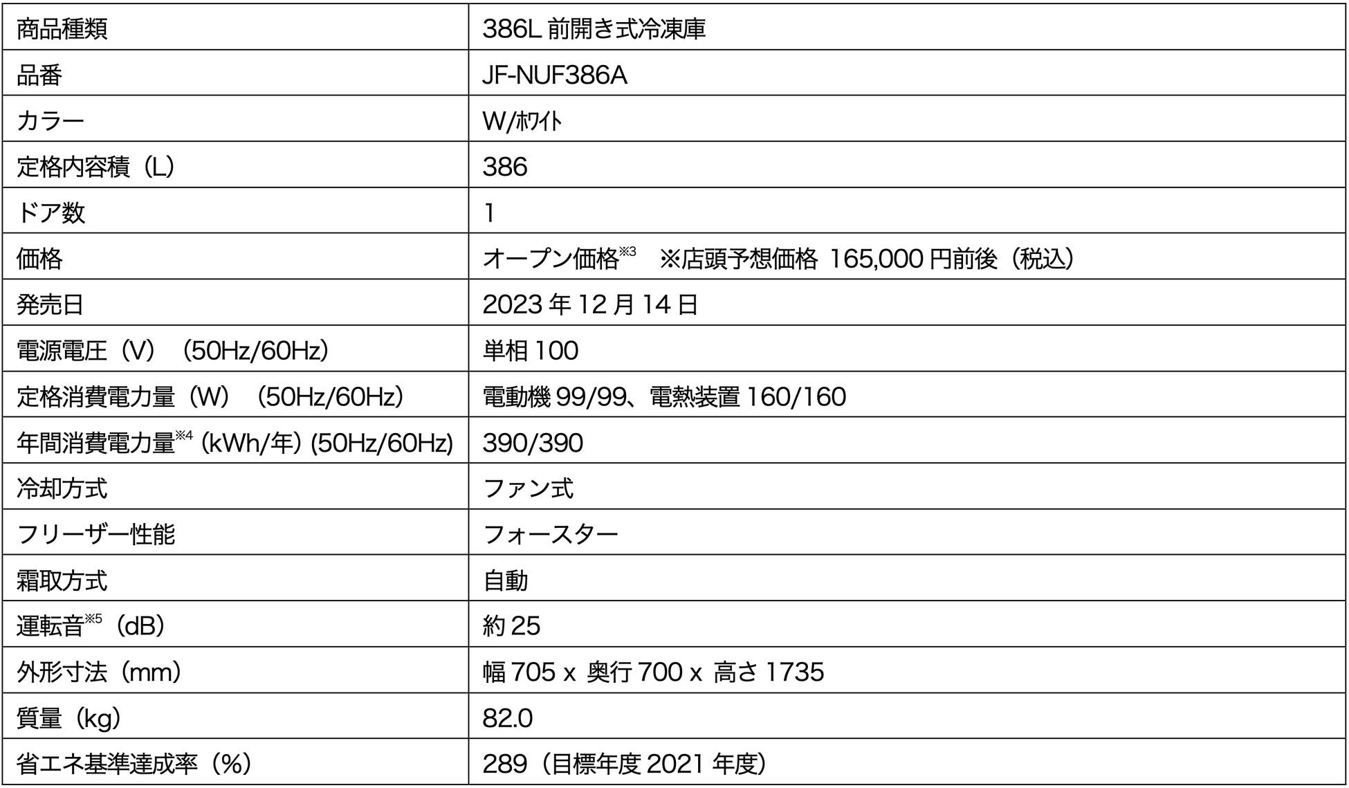 ◆ 仕様【386L前開き式冷凍庫(JF-NUF386A)】