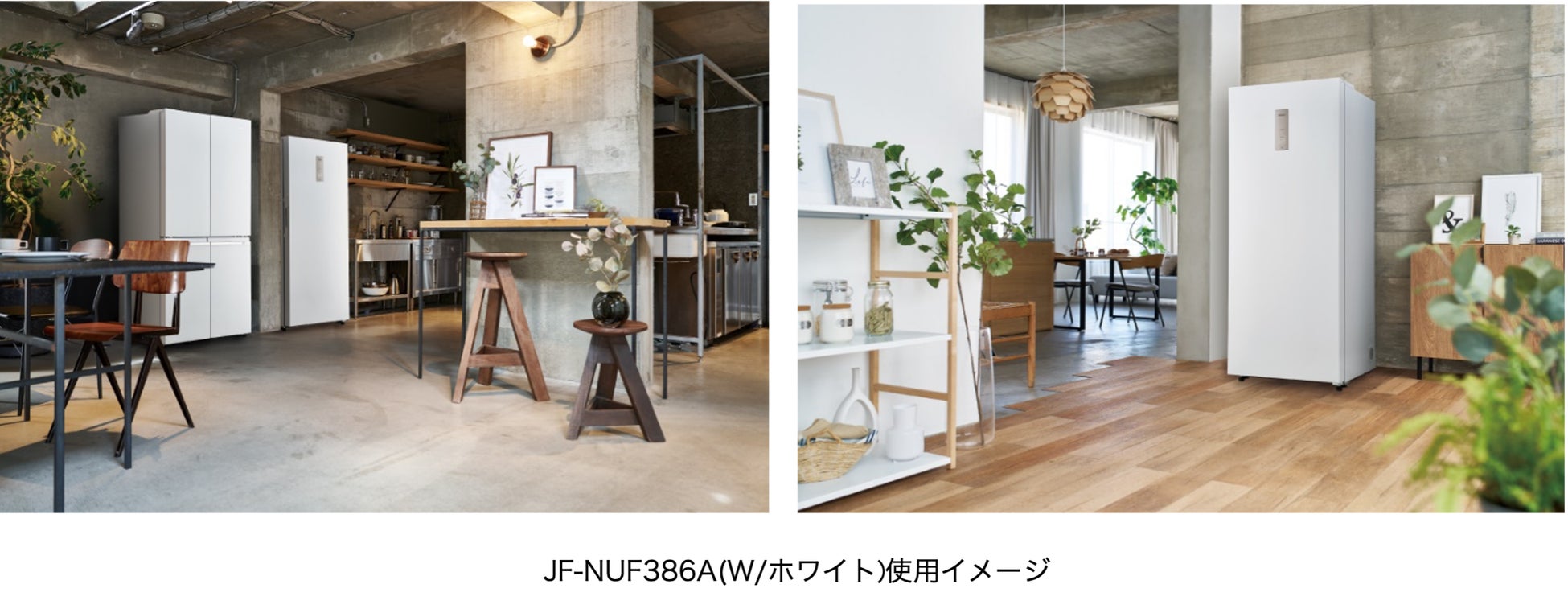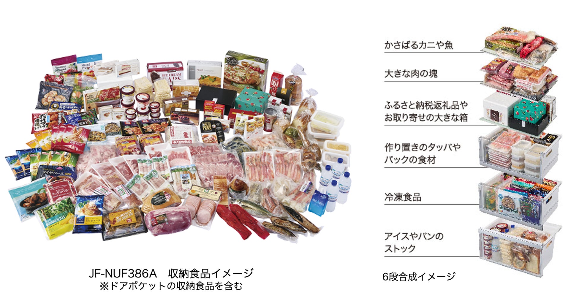 この度発売する386L前開き式冷凍庫(JF-NUF386A)は、家庭用前開き式冷凍庫として国内最大容量※1となる386Lを実現しました。かさばる食品やふるさと納税返礼品などの大きな箱ものから冷凍食品や作り置きのタッパー、アイスクリームなどの小さなものまで大容量の食品を整理して収納いただくことが可能です。