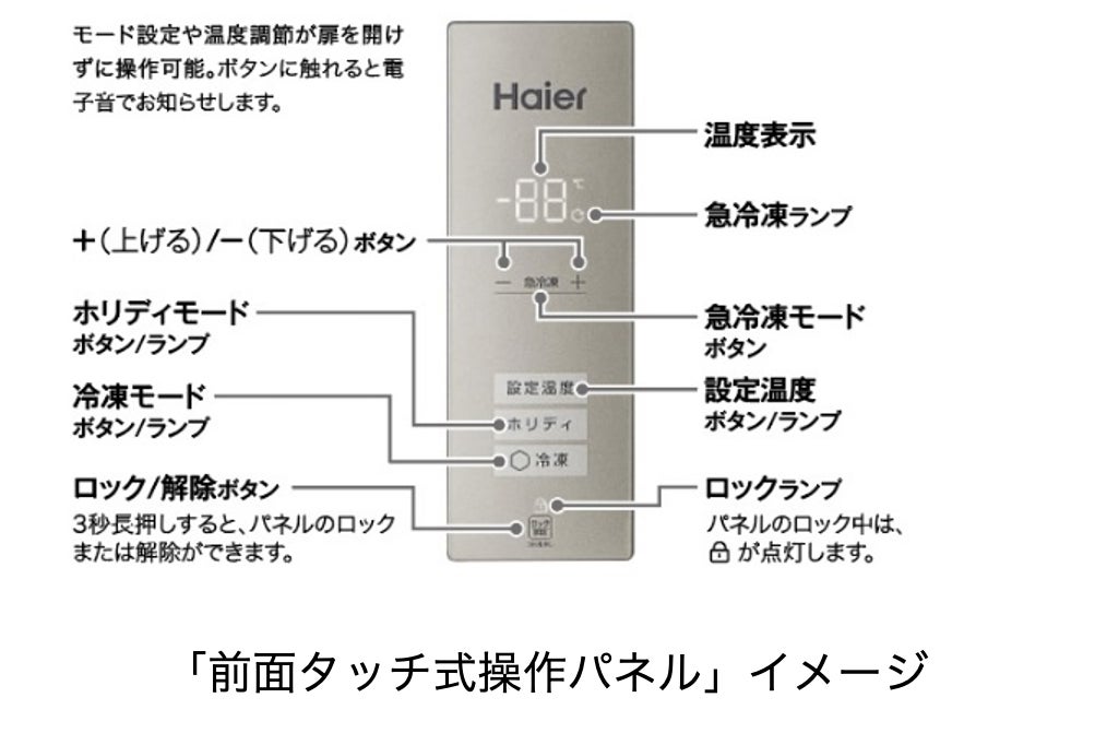 本製品には、大きな扉でも開けやすい「アシストハンドル」を採用。また、扉を開けずに-24℃~-14℃の温度調節の操作が可能な「前面タッチ式操作パネル」、庫内の前面を明るく照らして長寿命で見やすい「LED庫内灯」などを搭載。使いやすさにこだわった機能が充実しております。