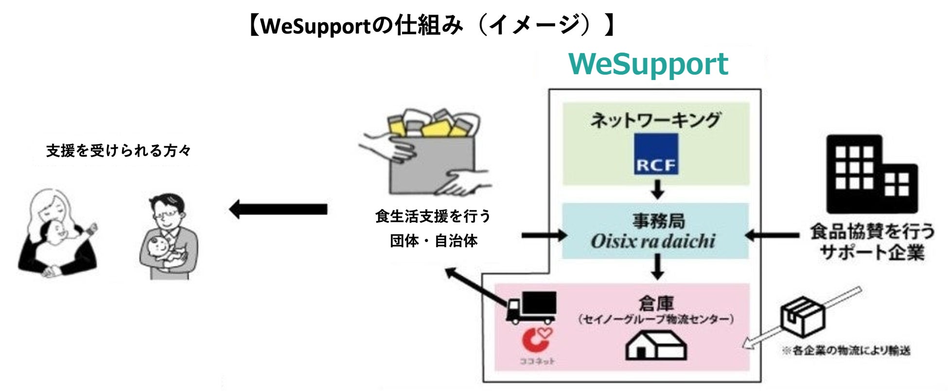 「WeSupport」は、一般社団法人RCF、オイシックス・ラ・大地株式会社、ココネット株式会社(セイノーホールディングスグループ)が連携して運営するプラットフォームです。「WeSupport」が食品の寄付にご協力いただけるサポート企業と、支援先の各団体とをマッチングさせ、各団体が運営するフードパントリーなどを通じて食品支援を行う仕組みです
