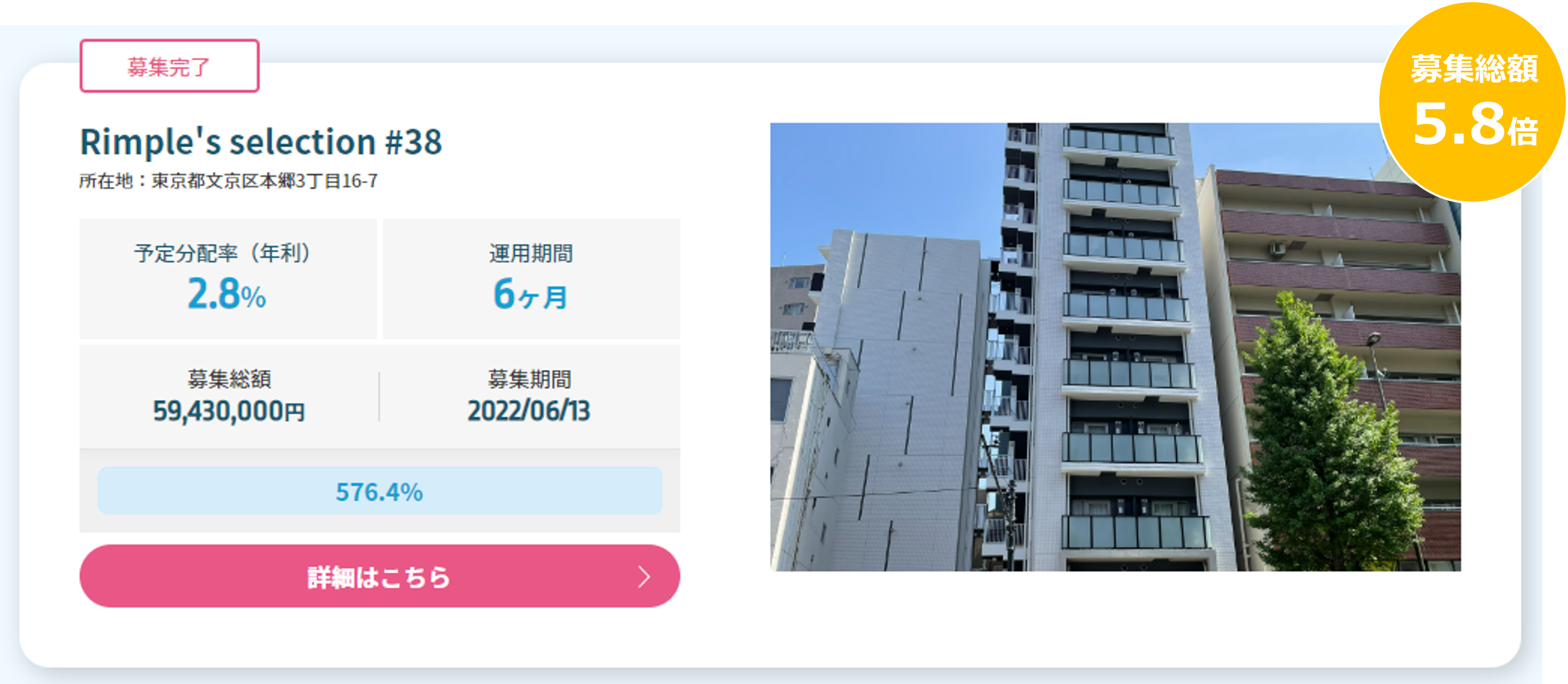 Rimple’s Selection#38募集総額576.4%の3.4億円の応募