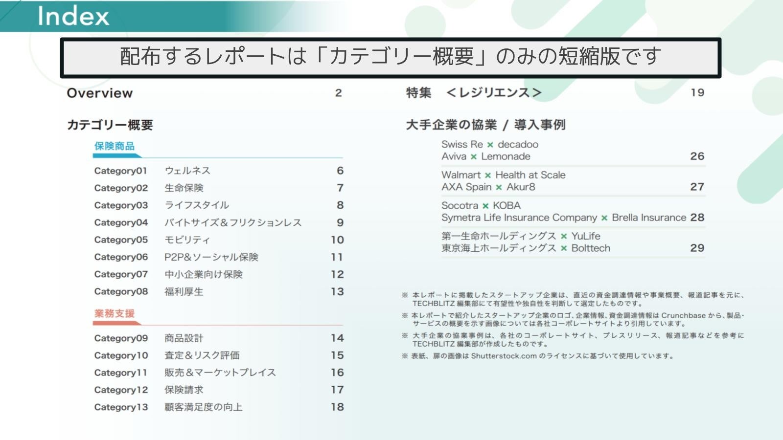 本レポートでは、トレンド性のある保険商品や保険業界の業務を支援するサービスや技術をカテゴライズし、それぞれの領域で有望なスタートアップをご紹介しています。また、特集では近年の気候変動などを要因とした自然災害や予期せぬリスクに対する「レジリエンス」を取り上げています。巻末では国内外の大手企業とスタートアップとの協業 / 導入事例をご紹介します。