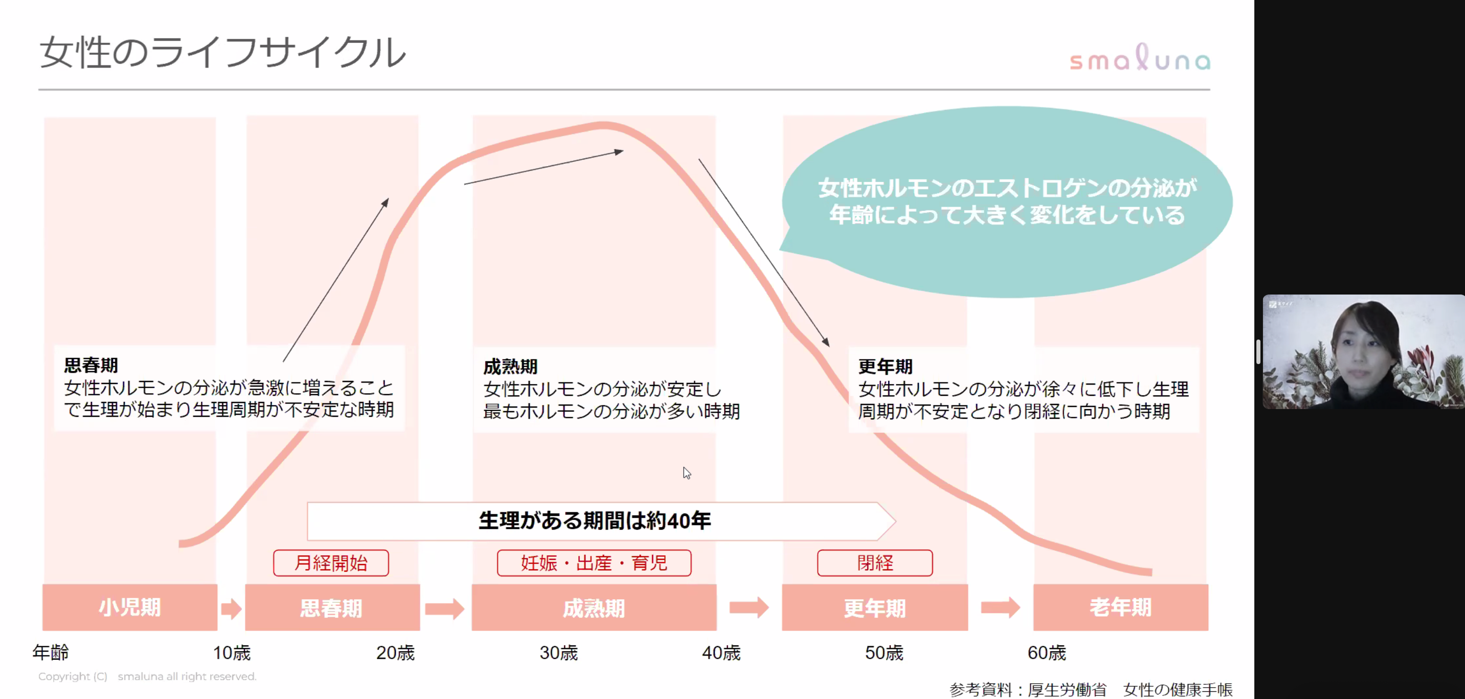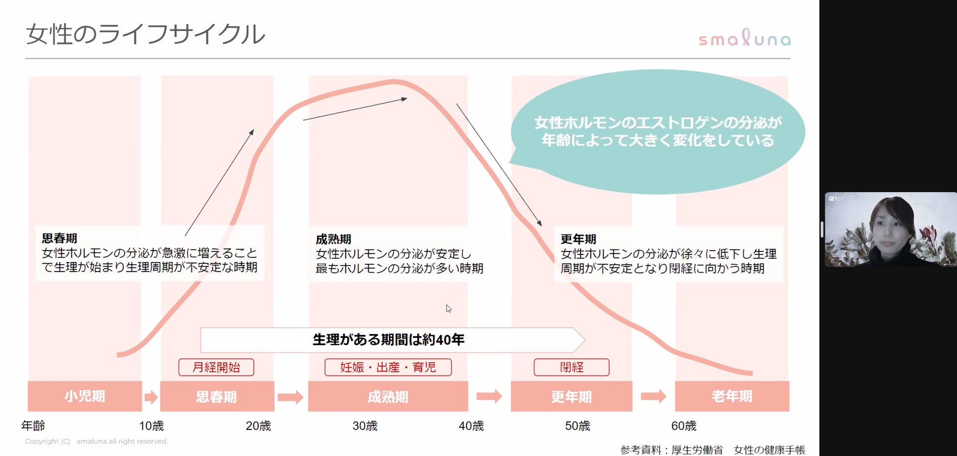 まず、女性の健康はまさに波のようなもので、月々の生理・更年期などライフサイクルの中でホルモンの影響を大きく受けますと紹介しました。また、更年期の具体的症状について詳しく知らない方も多いため、参加者にも、今回のセミナーをご自身のライフサイクルに役立ててほしいと話しました。