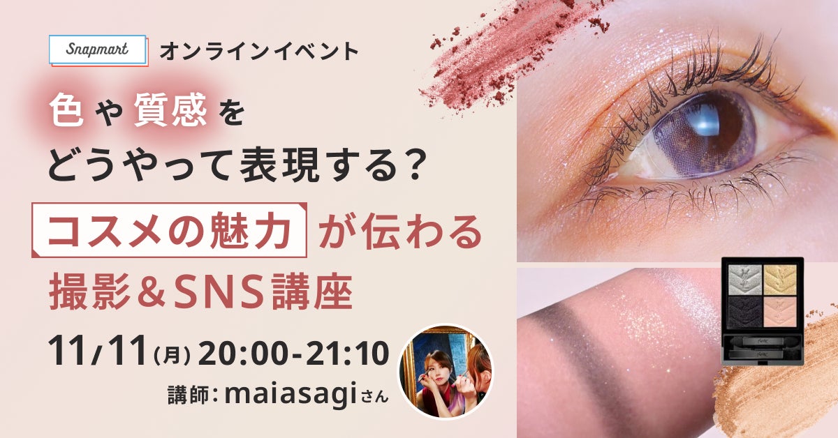フォトグラファーのmaiasagiさんを講師にお招きして学ぶ、コスメの魅力を引き出す撮影&SNS発信のコツ。意外とできる人が少ない、コスメの色や質感の表現方法について、重点的に学べる講座です。