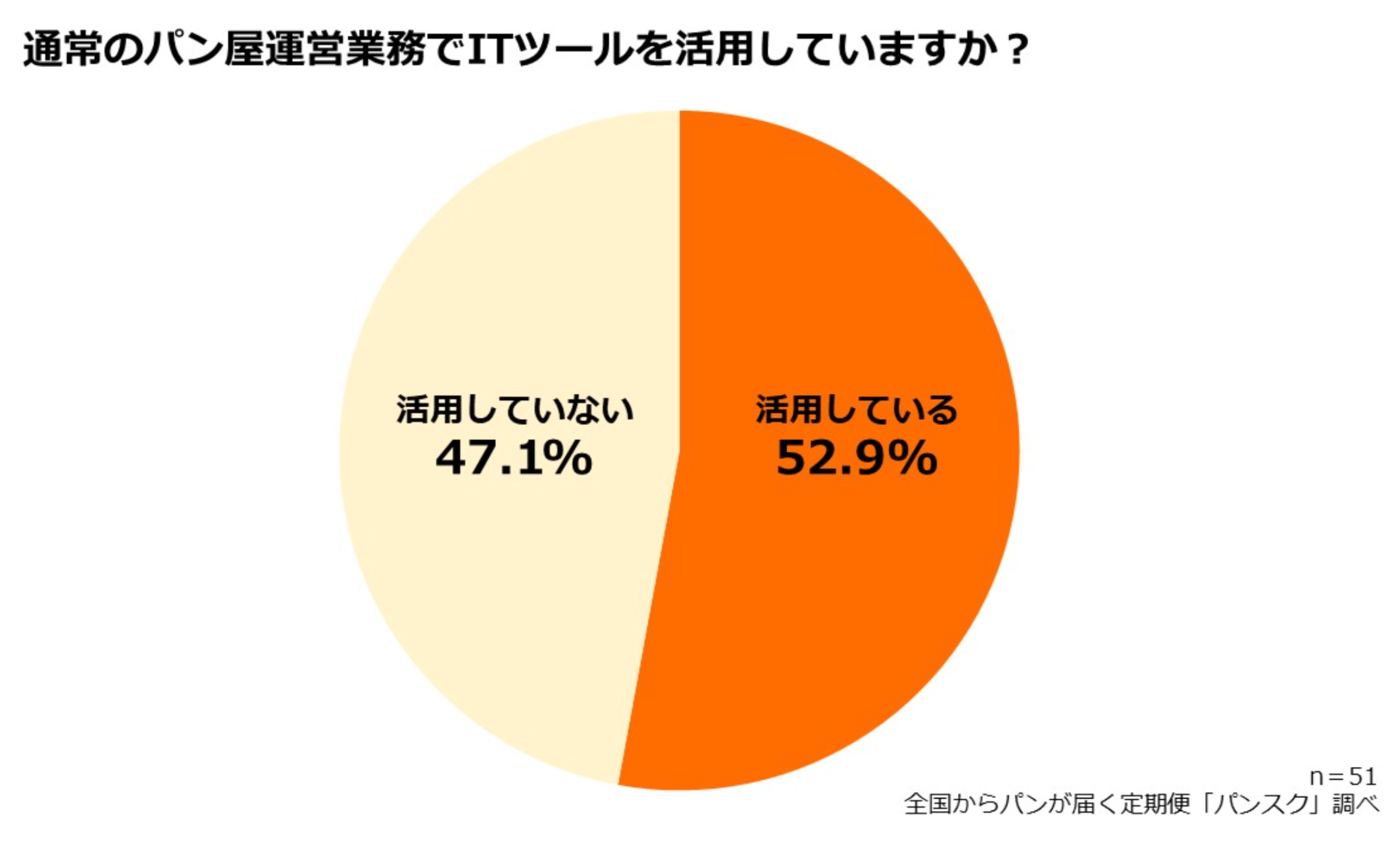 通常のパン屋運営業務でITツールを活用しているパン屋さんは52.9%、活用していないパン屋さんは47.1%ということが判りました。