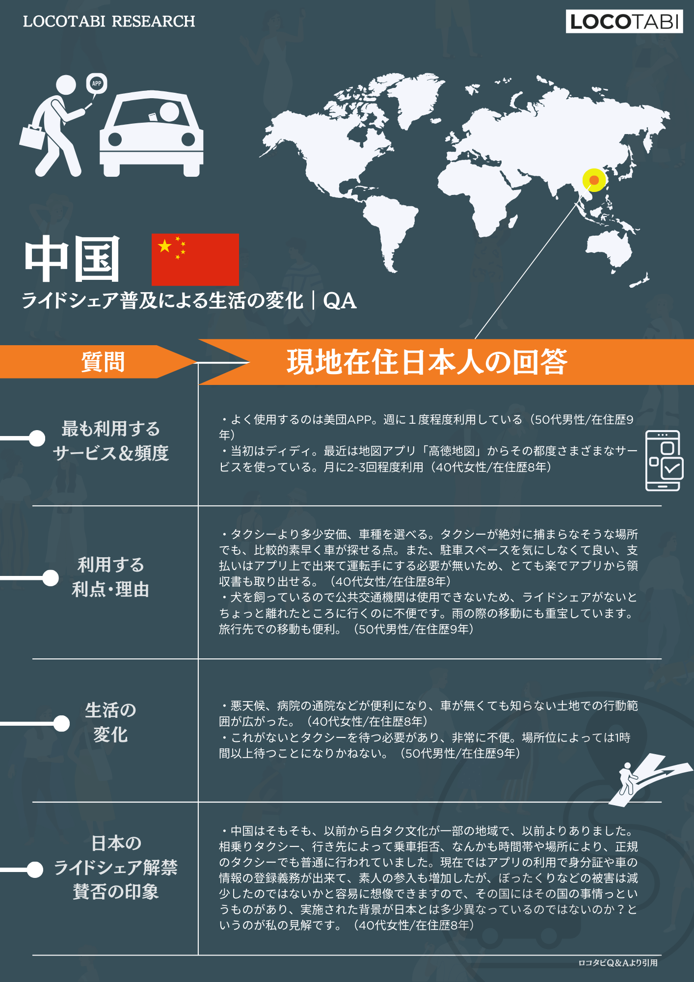 「中国ではディディが出来た当初、運転手が乗客女性を殺害する事件が続けて発生したので、日本がサービスを解禁を検討する理由がとても理解できます。また、そもそも中国は白タク文化があり、政府としても彼らを管理できるという理由で、配車アプリの推進をした背景もあると思うので、日本とはすこし事情も異なるようにも感じますね。」